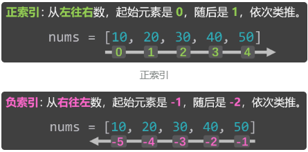 下标又叫索引值,其实就是元素在列表中的“位置编号”,分为:正索引和负索引。