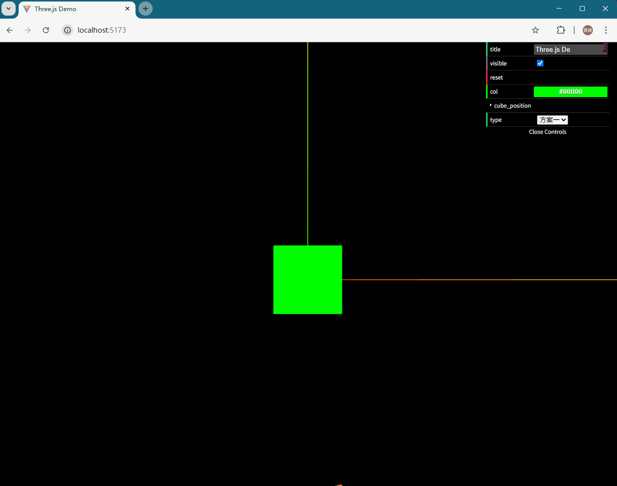 示例4:添加一个数字滑动控制器,来控制立方体对象 cube 对象的 x 轴坐标的位置属性position.x,从而控制立方体在 x 轴上的位置。